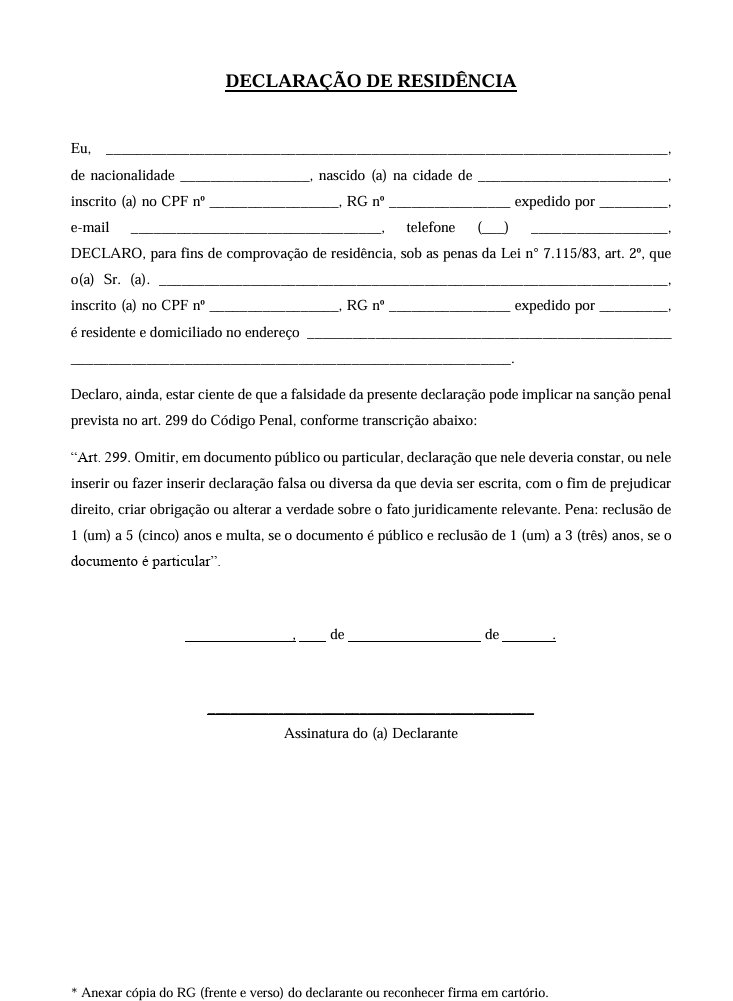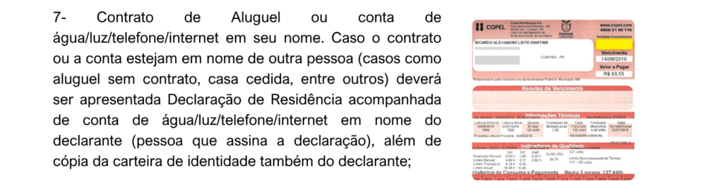 4- Contrato de Aluguel ou conta de água/luz/telefone/internet em seu nome. Caso o contrato ou a conta estejam em nome de outra pessoa (casos como aluguel sem contrato, casa emprestada, entre outros) deverá ser apresentada Declaração de Residência acompanhada de conta de água/luz/telefone/internet em nome do declarante (pessoa que assina a declaração), além de cópia da carteira de identidade também do declarante;