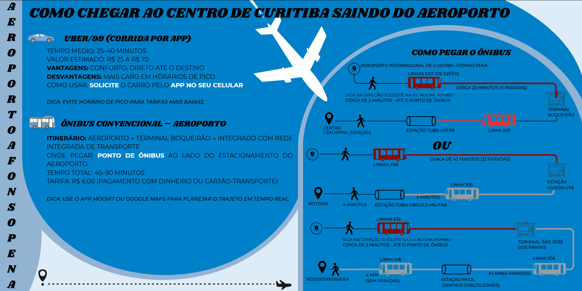 Quando você chegar em Curitiba vai desembarcar no Aeroporto de Curitiba (CWB): O aeroporto está localizado em São José dos Pinhais (cidade da Região Metropolitana), cerca de 18 km do centro de Curitiba. Para chegar ao Centro, você pode optar por táxi, aplicativos de transporte (como Uber e 99) ou ônibus.
