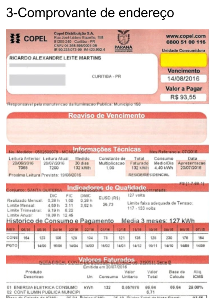 6 – Comprovante de endereço (conta de luz, água ou internet residencial). Caso esteja em nome de terceiro, trazer também declaração assinada e com firma reconhecida no cartório pelo proprietário, ou a presença do mesmo no dia do agendamento.