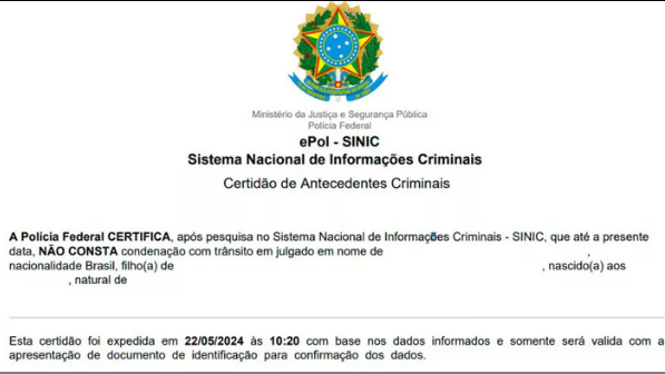 7 – Antecedentes Criminais do Brasil (documentos válidos por 90 dias após emissão). A Certidões de antecedentes criminais pode ser obtida no site https://www.policiacivil.pr.gov.br/Servico%20s/Certidao-de-Antecedentes-Criminais
