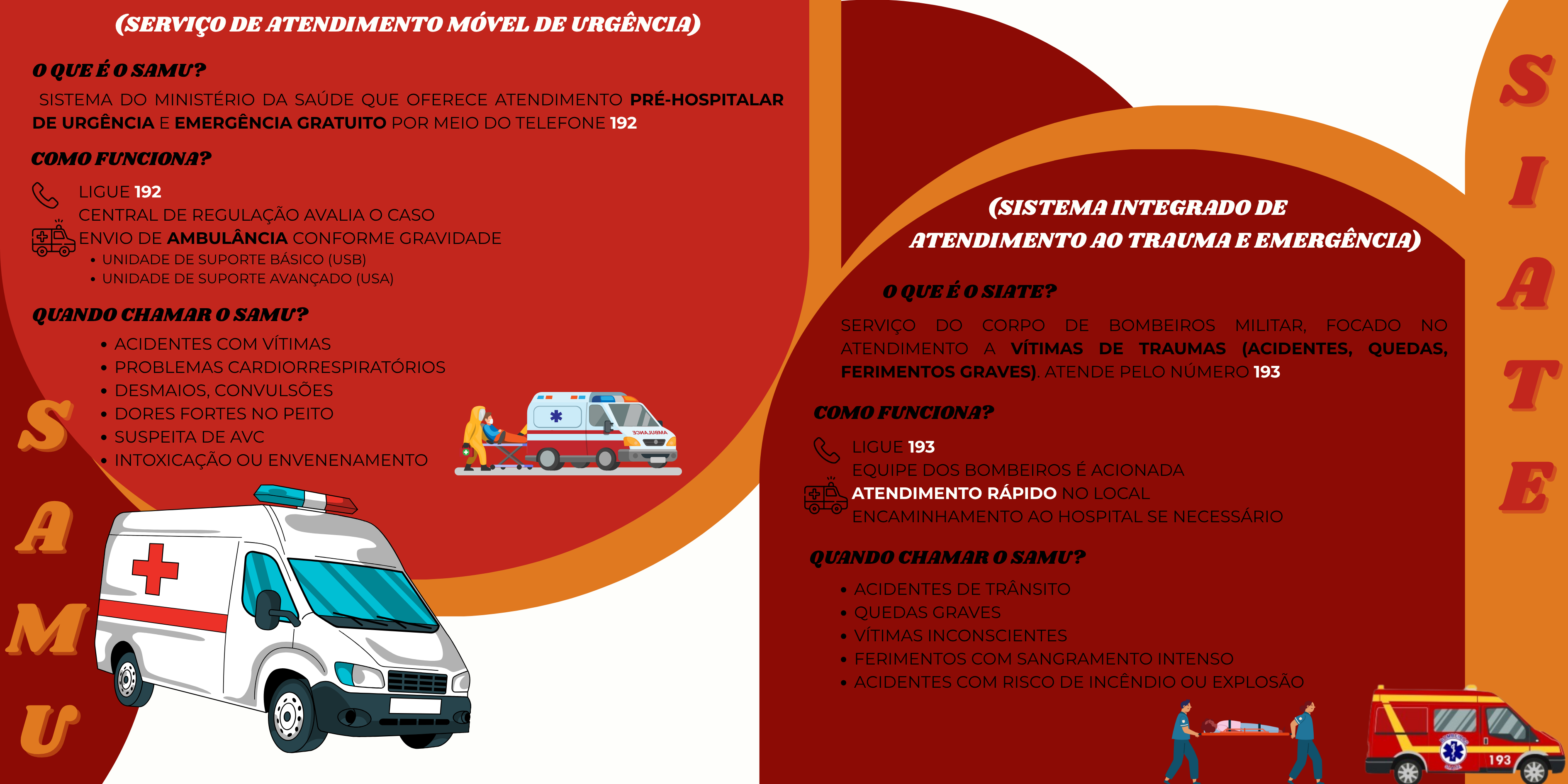 Em caso de emergência médica, se você for usar o SUS, ligue para o Samu (192) em casos de urgência e emergência médica, como dor no peito, suspeita de AVC, falta de ar, perda de consciência, convulsões, intoxicações e hemorragias. Ou ligue para o Siate (193) em caso de acidentes de trânsito, ferimentos por arma de fogo ou branca, quedas, choques elétricos, ataques de animais, afogamentos, soterramentos e queimaduras.